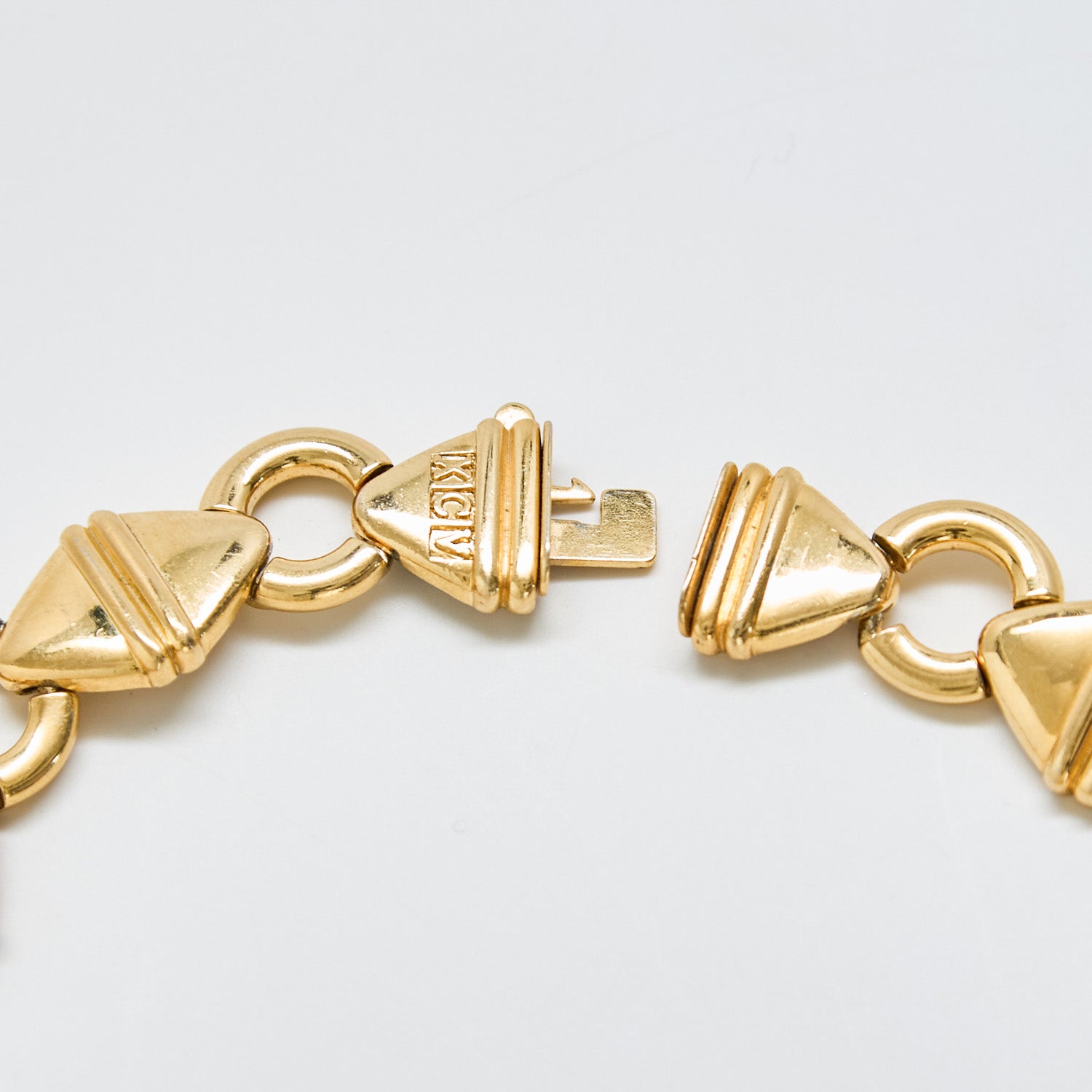 A stunning statement piece from the vintage LCI (Liz Claiborne Inc.) collection, this gold-tone necklace captures the bold sophistication of late 1980s to early 1990s design. The piece features graduated geometric pyramid-style links, each with a subtle ridged stripe detail, connected by rounded gold rings for fluid movement and balance. Perfect worn solo as a statement or layered with modern chains, this vintage LCI piece embodies timeless style with a touch of retro edge — ideal for collectors and lovers of sculptural vintage jewelry.